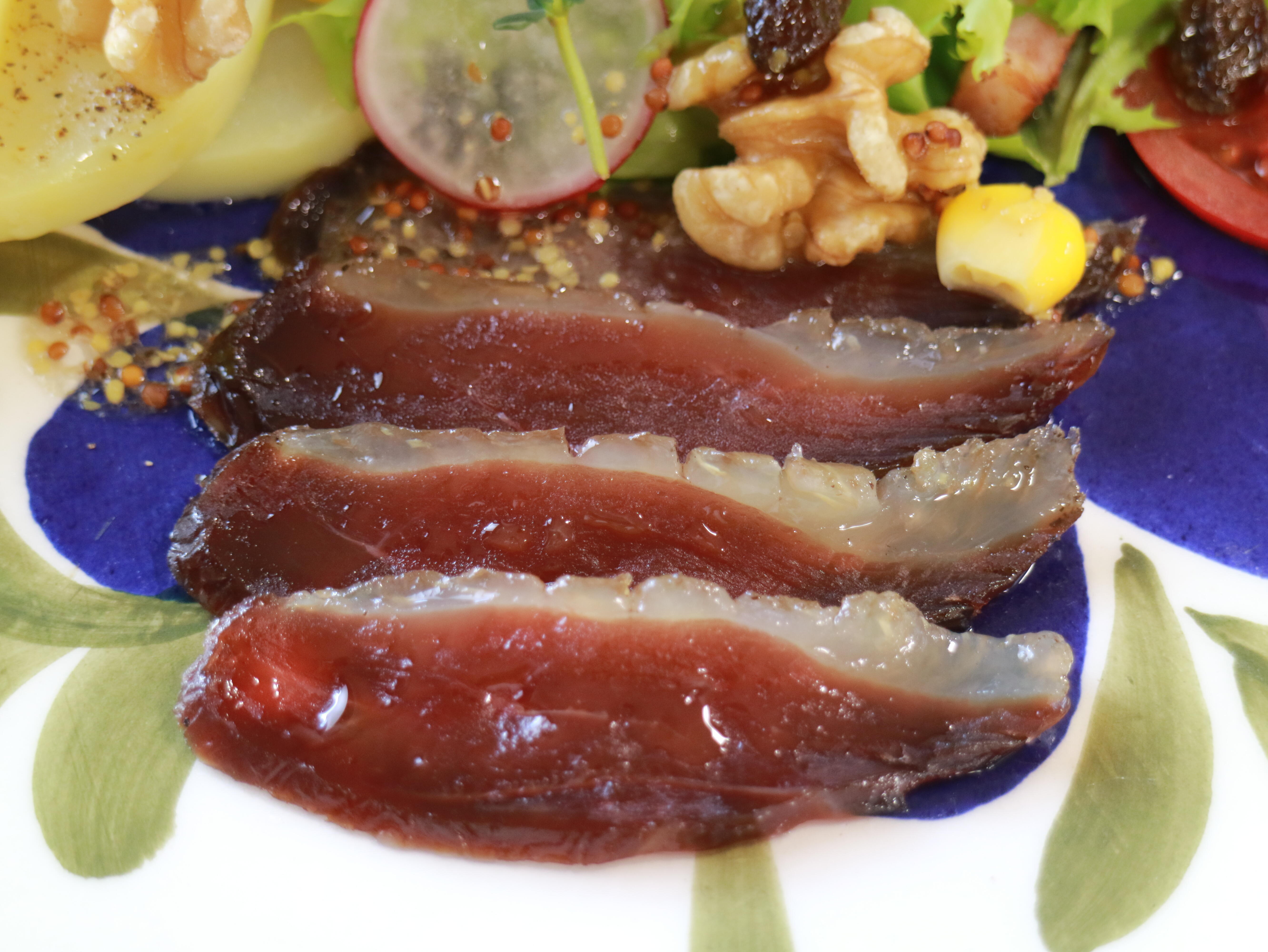 現代は、鵞鳥や鴨にガバージュして(とうもろこしを大量に流し込むように食べさせる)太らせてから、肥大させた肝臓(フォアグラ)を取り出します。使う料理人の好みやお店のグレード・規模によっての使い分けもあると思いますが、一般的にテリーヌ類には、フォアグラ・ド・オワ(鵞鳥)を。ポワレ(フライパン焼き)などの焼きには、フォアグラ・ド・カナール(鴨)が適していると言われています。フォアグラを取った後の肉や内臓は、捨てることなくコンフィなどに加工して保存食として食されます。Salade Périgourdineには、フォアグラと共にもうひとつの主役として、この鴨のコンフィや燻製、生ハムも盛られます。