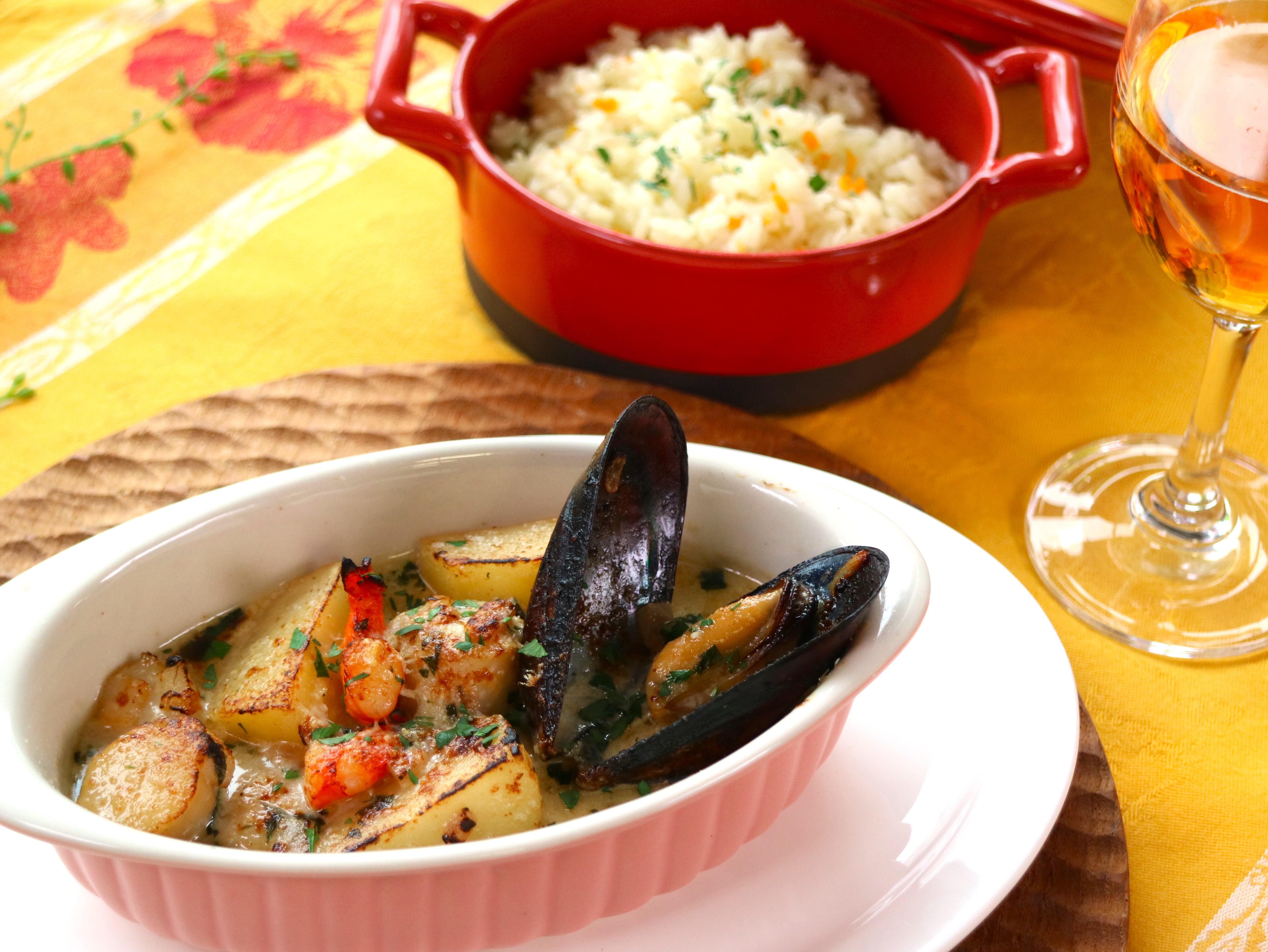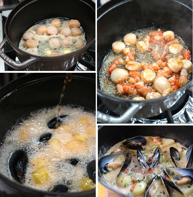 - 帆立、海老、ムール貝をココット鍋に戻し、味を調え、パセリを加え、お皿に盛り付ける。