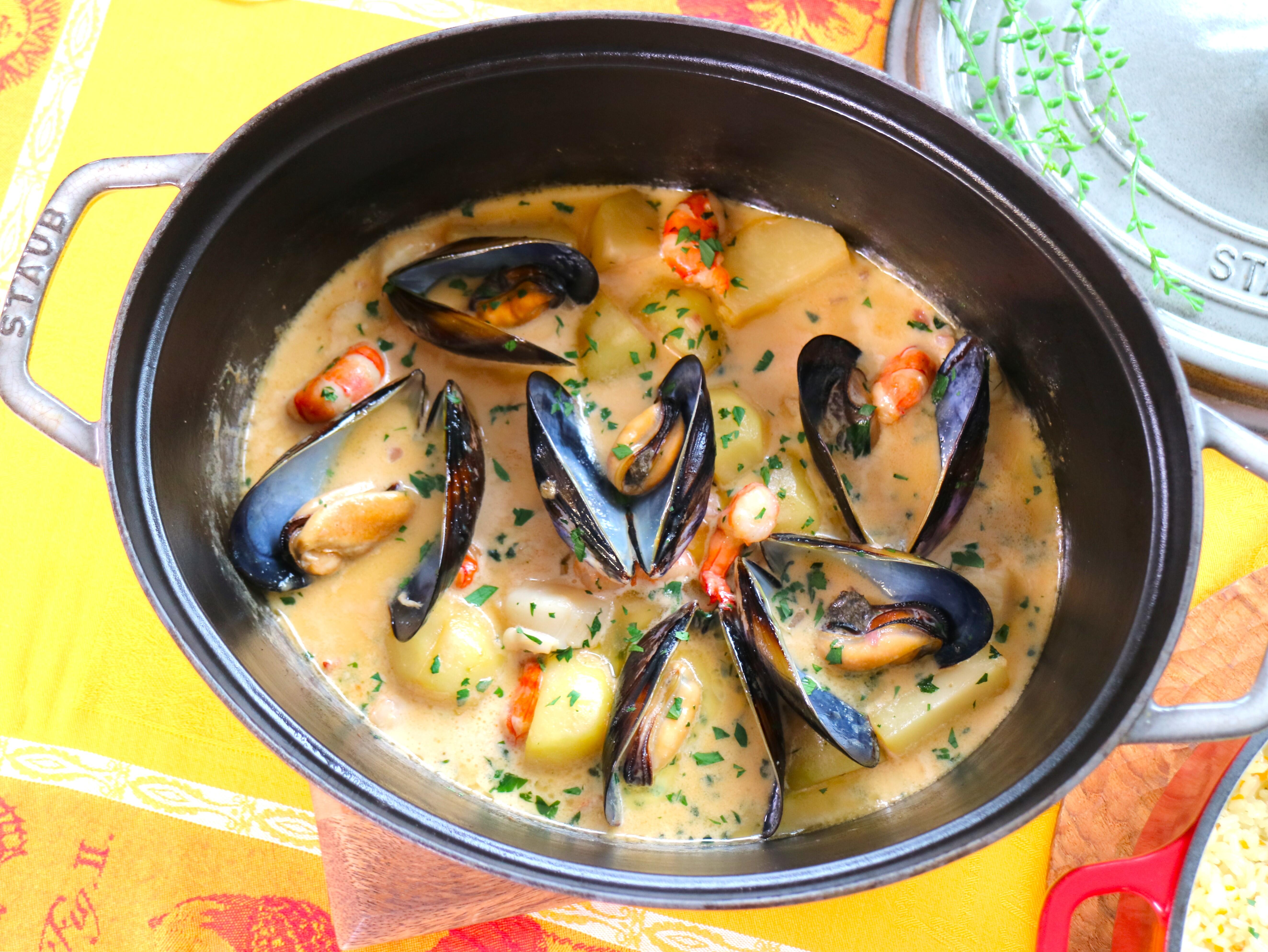 - ムール貝を取り出し、生クリームを加え、煮詰めながら、ジャカイモに火を通す。