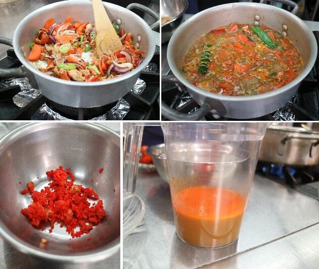 - 鍋にサラダ油をしき、エマンセ※1した香味材料と2をシュエ ※3する。水をムイエ※4し20分間煮出してパッセ※5し、フュメ・ド・オマールとする。